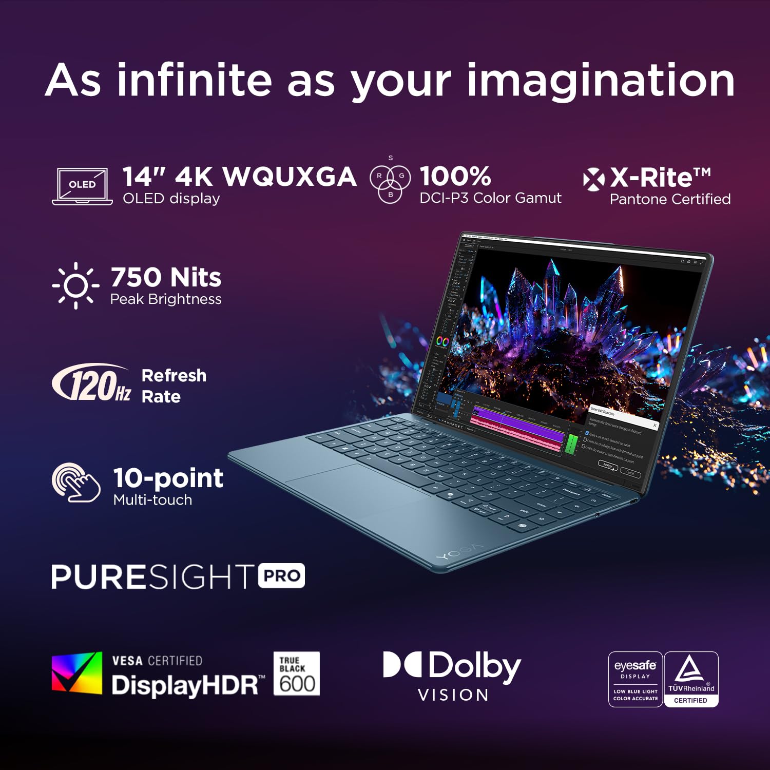 Display: 14″ 4K WQUXGA (3840×2400) OLED 750nits (peak) / 600nits (typical) Glossy, 100% DCI-P3, 120Hz, Eyesafe®, Dolby Vision®, DisplayHDR™ True Black 600, Glass, Touch, X-Rite®, PureSight Pro